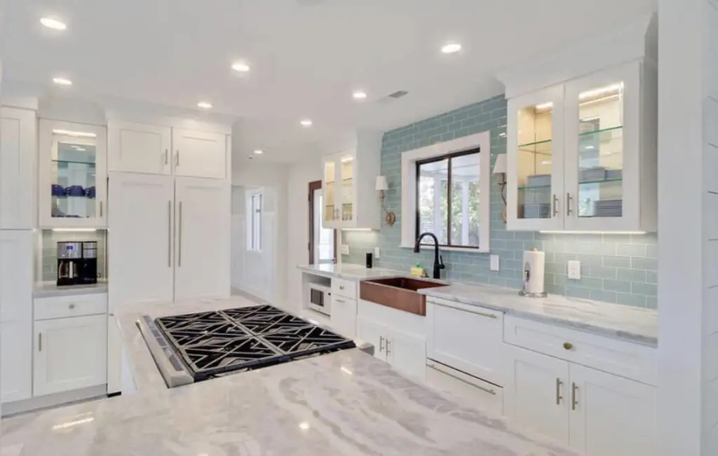 White walls with accessories giving the room color, Shiplap, Marble Counters