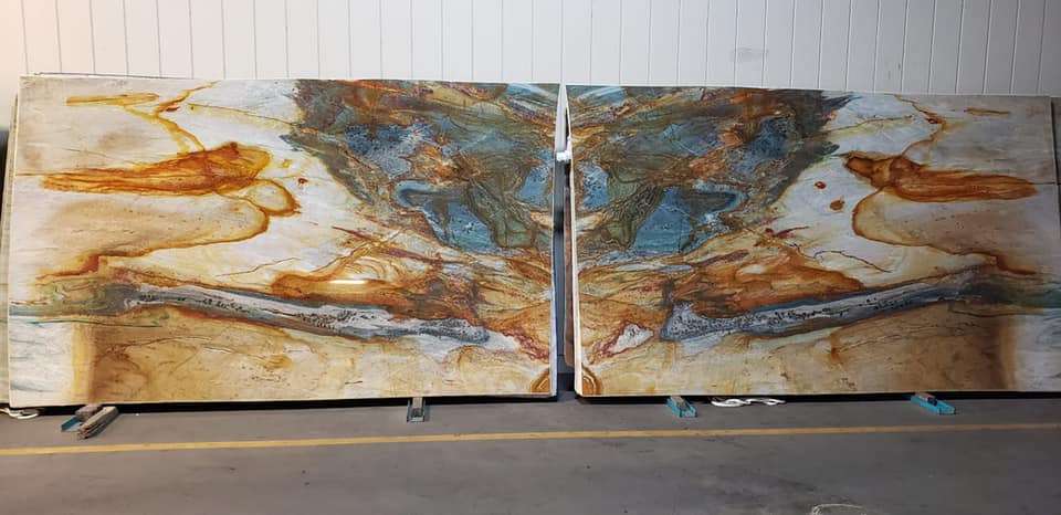 Bookmatched Louise Blue quartzite slabs with dramatic blue, gold and rust veining in warehouse display